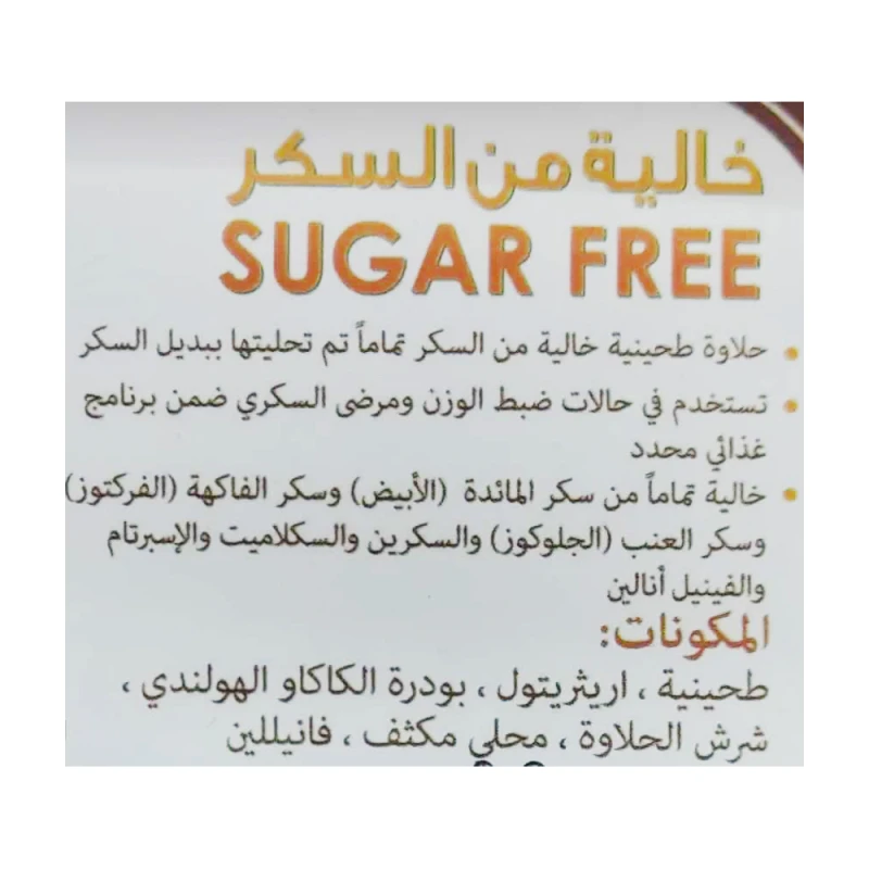 المكونات: طحينية، بودرة كاكاو كامل الدسم، محلي لايت آند سويت (إريثريتول ، سكرلوز) ، إنولين، شرش الحلاوة، مثبت، نكهة فانيلا.