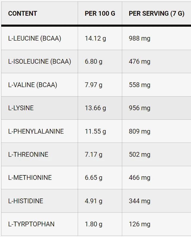 يوفر هذا المنتج مزيجًا دقيقًا من الأحماض الأمينية الأساسية، بما في ذلك BCAAs (L-Leucine، L-Isoleucine، L-Valine) وغيرها من الأحماض الأمينية الحيوية، مما يضمن دعمًا شاملاً لنمو العضلات وإصلاحها واستعادتها.