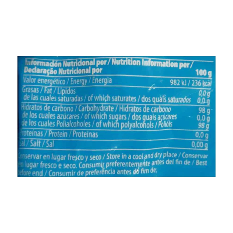 قيمة الطاقة: 982 كيلو جول · قيمة الطاقة: 236 سعرة حرارية · دهون: 0 جرام · مشبعة: 0 جرام · كربوهيدرات: 98.2 جرام · منها سكريات: 0 جرام · منها كحول متعدد: 98.2 جرام ألياف غذائية: 0 جرام بروتين: 0 ز ملح: 0 جم