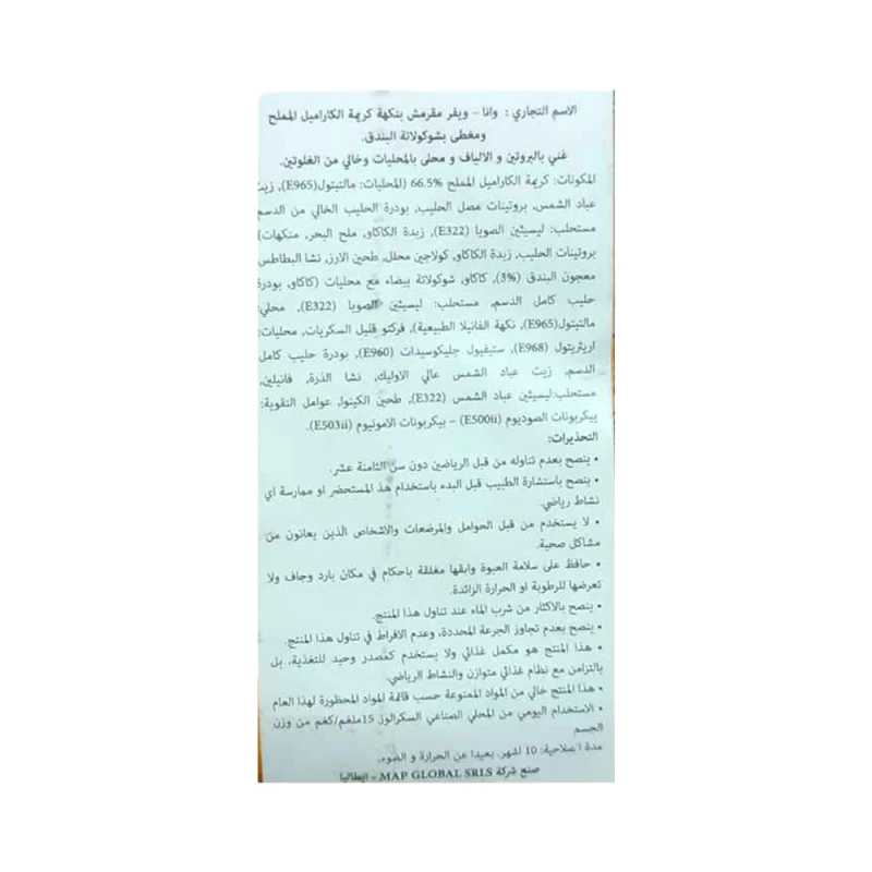 المكونات : كريم بنكهة الكراميل المملح (66.5٪) [محلي: مالتيتول (E965) ، زيت عباد الشمس ، حليب بروتين مصل اللبن ، مسحوق حليب منزوع الدسم ، مستحلب: ليسيثين من فول الصويا (E322) ، زبدة الكاكاو ، ملح البحر ، منكهات] ، بروتين من الحليب ، زبدة الكاكاو ، الكولاجين المائي ، دقيق الأرز ، نشا البطاطس ، لب البطاطس ، زبدة الكاكاو ، كولاجين البندق المائي (3٪) ، كتلة الكاكاو ، شوكولاتة بيضاء مع المُحليات [زبدة الكاكاو ، مسحوق حليب القمح الكامل ، مستحلب: ليسيثين من فول الصويا (E322) ، محلي: مالتيتول (E965) ، نكهة الفانيليا الطبيعية] ، فركتو-أوليغوساكاريدس ، المحليات: إريثريتول (E968) وجليكوسيدات ستيفيول (E960) ، مسحوق حليب القمح الكامل ، زيت عباد الشمس عالي الأوليك ، نشا الذرة ، فانيلين ، مستحلب: ليسيثين عباد الشمس (E322) ، دقيق الكينوا ، عوامل رفع: بيكربونات الصوديوم (E500ii) - بيكربونات الأمونيوم (E503ii).