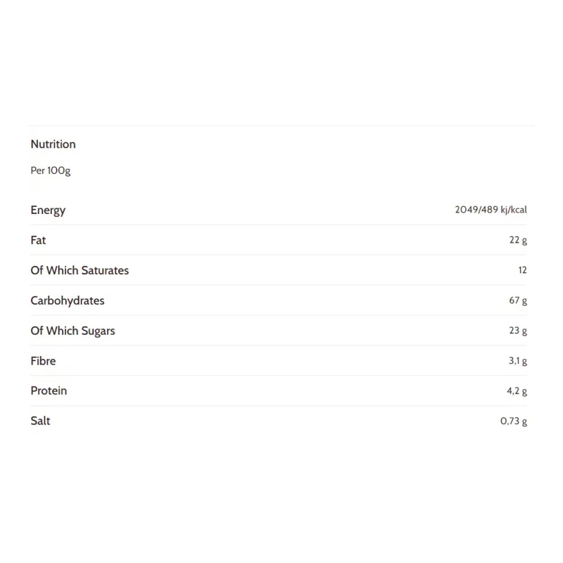 دقيق الذرة، شوكولاتة داكنة (كتلة الكاكاو*، سكر، زبدة الكاكاو*)، ليسيثين الصويا، نشا الذرة، سكر، زيت النخيل، زبدة (حليب)، مسحوق الحليب، شراب الذرة، نشا الذرة المعدل، بيكربونات الأمونيوم، بيكربونات الصوديوم، نشا التابيوكا المعدل، ملح بحري، نكهة طبيعية.يحتوي على: الحليب والصويا.قد يحتوي على: الترمس ومكسرات شجرية.