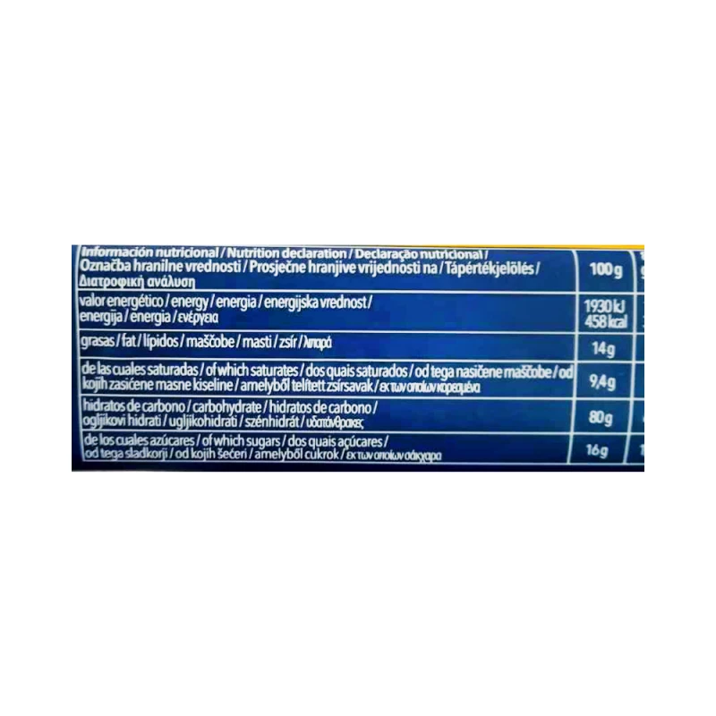 نشا الذرة، دقيق الذرة، زبدة (حليب)، سكر، نشا التابيوكا المعدل، بيض، مسحوق الحليب كامل الدسم، شراب الشمندر السكري، مستحلب: إسترات حمض ثنائي الأسيتيل الطرطريك لأحادي وثنائي الغليسريدات للأحماض الدهنية (من زيت اللفت)؛ مواد رافعة: كربونات هيدروجين الأمونيوم، كربونات هيدروجين الصوديوم؛ ملح، نكهات طبيعية، منظم حموضة: حمض الستريك.