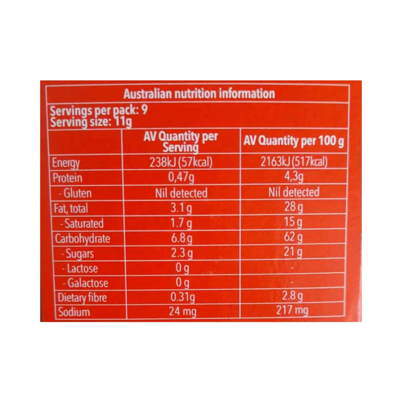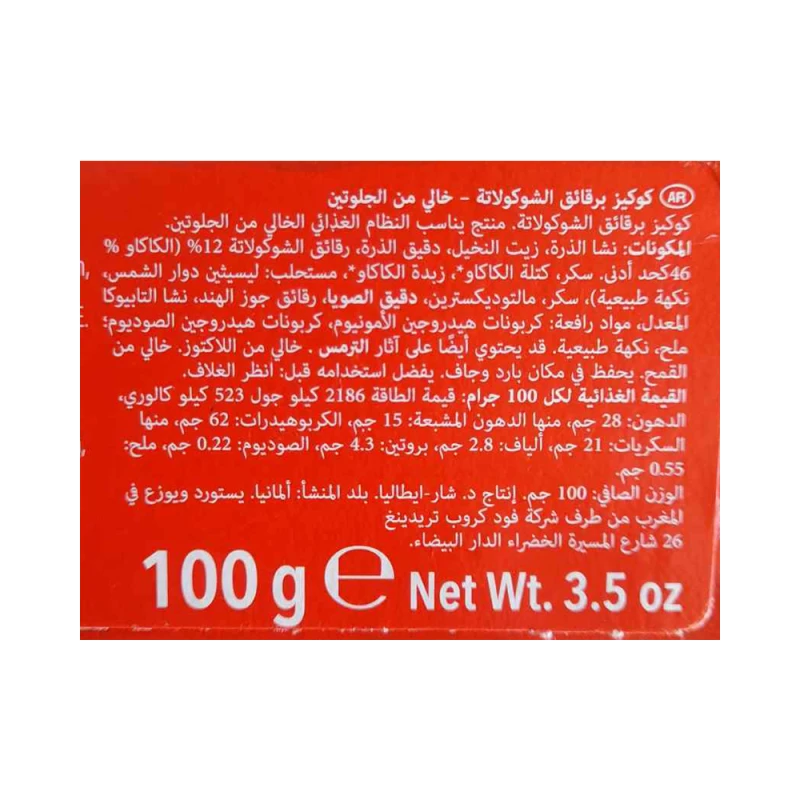 نشا الذرة، زيت النخيل، دقيق الذرة، رقائق الشوكولاتة 12٪ (سكر، كتلة الكاكاو، زبدة الكاكاو، مستحلب: ليسيثين عباد الشمس؛ نكهة طبيعية)، سكر، مالتوديكسترين، دقيق الصويا، جوز الهند المبشور، نشا التابيوكا المعدل، عوامل زيادة الحجم (كربونات الهيدروجين الأموني، بيكربونات الصوديوم)، ملح، نكهة طبيعية.