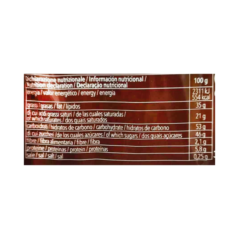 دهن النخيل، سكر، دقيق الأرز، نشا البطاطا، دقيق التيف، دقيق الصويا، مسحوق كاكاو قليل الدسم، مستحلب: ليسيثين الصويا؛ زيت جوز الهند، صفار البيض، ملح، مادة رافعة: بيكربونات الصوديوم.