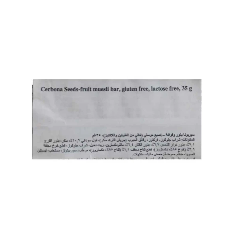 شراب الجلوكوز - الفركتوز ، رقائق الحبوب المبثوقة (دقيق الذرة ، السكر) ، الفول السوداني 10.6٪ ، السكر ، بذور اليقطين 7.1٪ ، بذور عباد الشمس 6.7٪ ، بذور الكتان 6.4٪ ، مالتوديكسترين ، دهن نباتي (نخيل) ، شراب جلوكوز ، خوخ 3.9 ٪ ، (برقوق 85٪ ، دكستروز) ، قطع تفاح مجففة 1.1٪ (تفاح 85٪ ، دكستروز) ، مرطب: سوربيتول ، مستحلب: ليسيثين الصويا ، منظم حموضة: حمض الماليك ، رائحة. قد يحتوي المنتج على مكسرات وبذور سمسم وبروتين حليب!