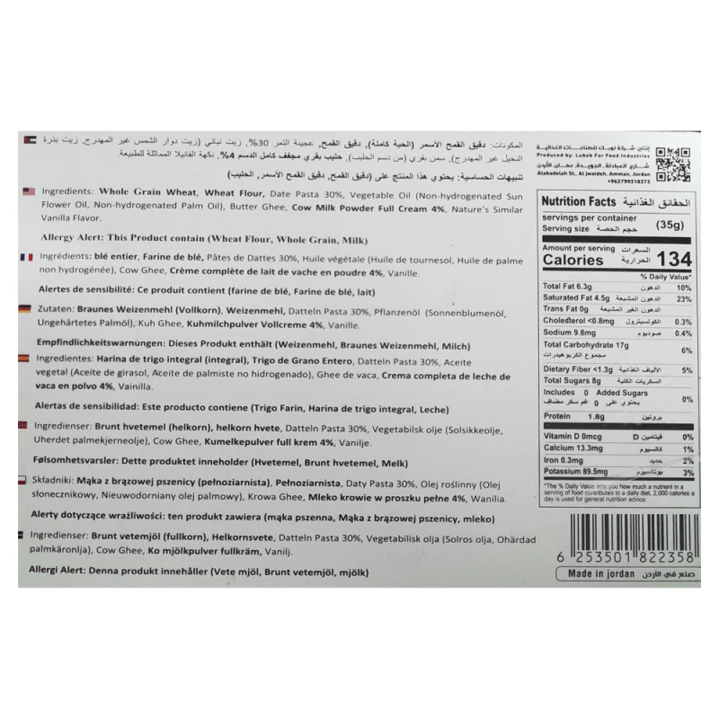 دقيق القمح الأسمر (الحبة الكاملة)، دقيق القمح، عجينة التمر 30%، زيت نباتي (زيت دوار الشمس غير المهدرج، زيت بذرة النخيل غير المهدرج)، سمن بقري (من دسم الحليب)، حليب بقري مجفف كامل الدسم 4%، نكهة الفانيلا المماثلة للطبيعية.