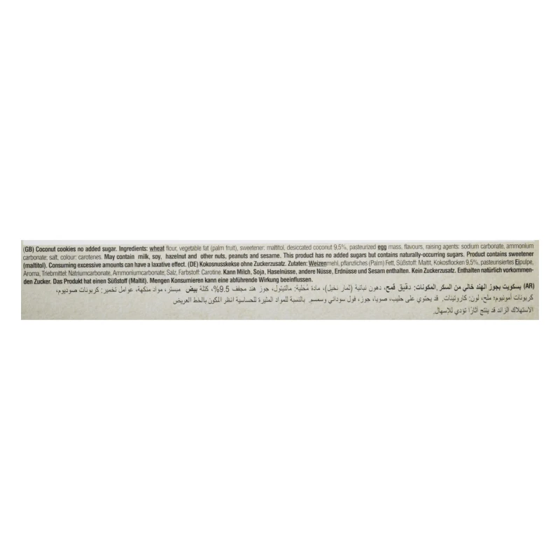 دقيق قمح، دهون نباتية (ثمار النخيل)، مادة محلية: مالتيتول، جوز هند مجفف 9.5%، كتلة بيض مبستر، مواد منكهة، عوامل تخمير: كربونات صوديوم، كربونات أمونيوم؛ ملح، لون: كاروتينات.