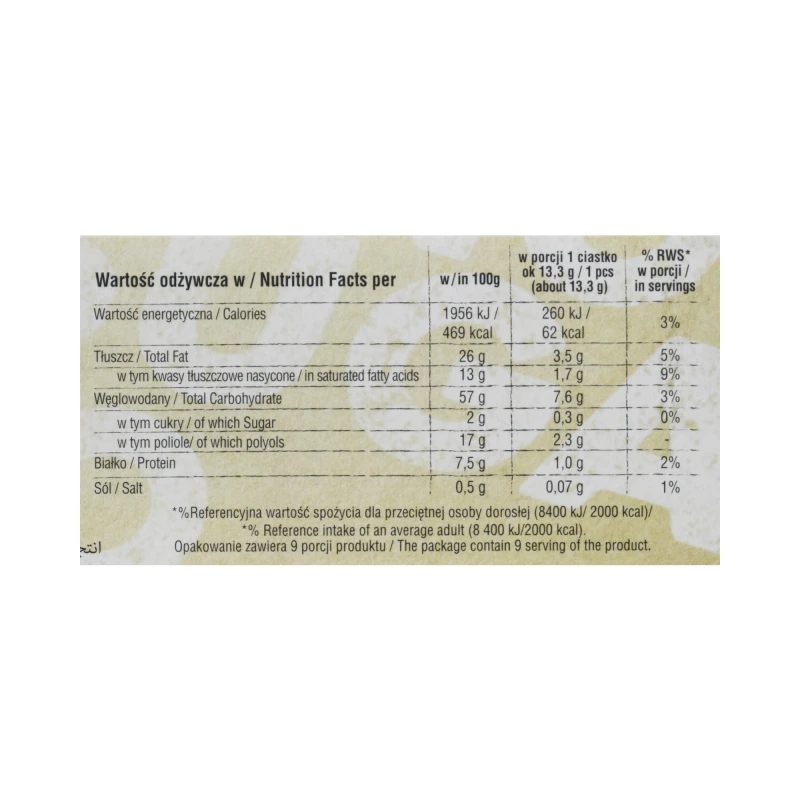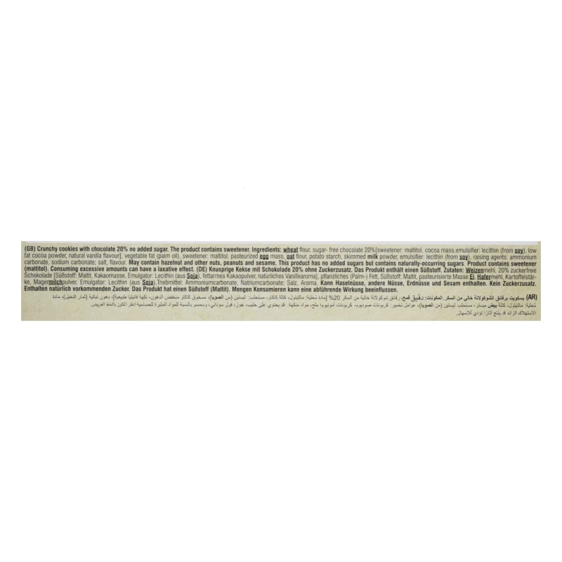 دقيق قمح، رقائق شوكولاتة خالية من السكر 20% [مادة محلية: مالتيتول، كتلة كاكاو، مستحلب: ليسيثين (من الصويا)، مسحوق كاكاو منخفض الدهون، نكهة فانيليا طبيعية]، دهون نباتية (زيت النخيل)، مادة محلية: مالتيتول، كتلة بيض مبستر، دقيق الشوفان، نشا البطاطس، حليب بودرة منزوع الدسم، مستحلب: ليسيثين (من الصويا)، مواد رافعة: بيكربونات الأمونيوم، بيكربونات الصوديوم؛ ملح، نكهة.